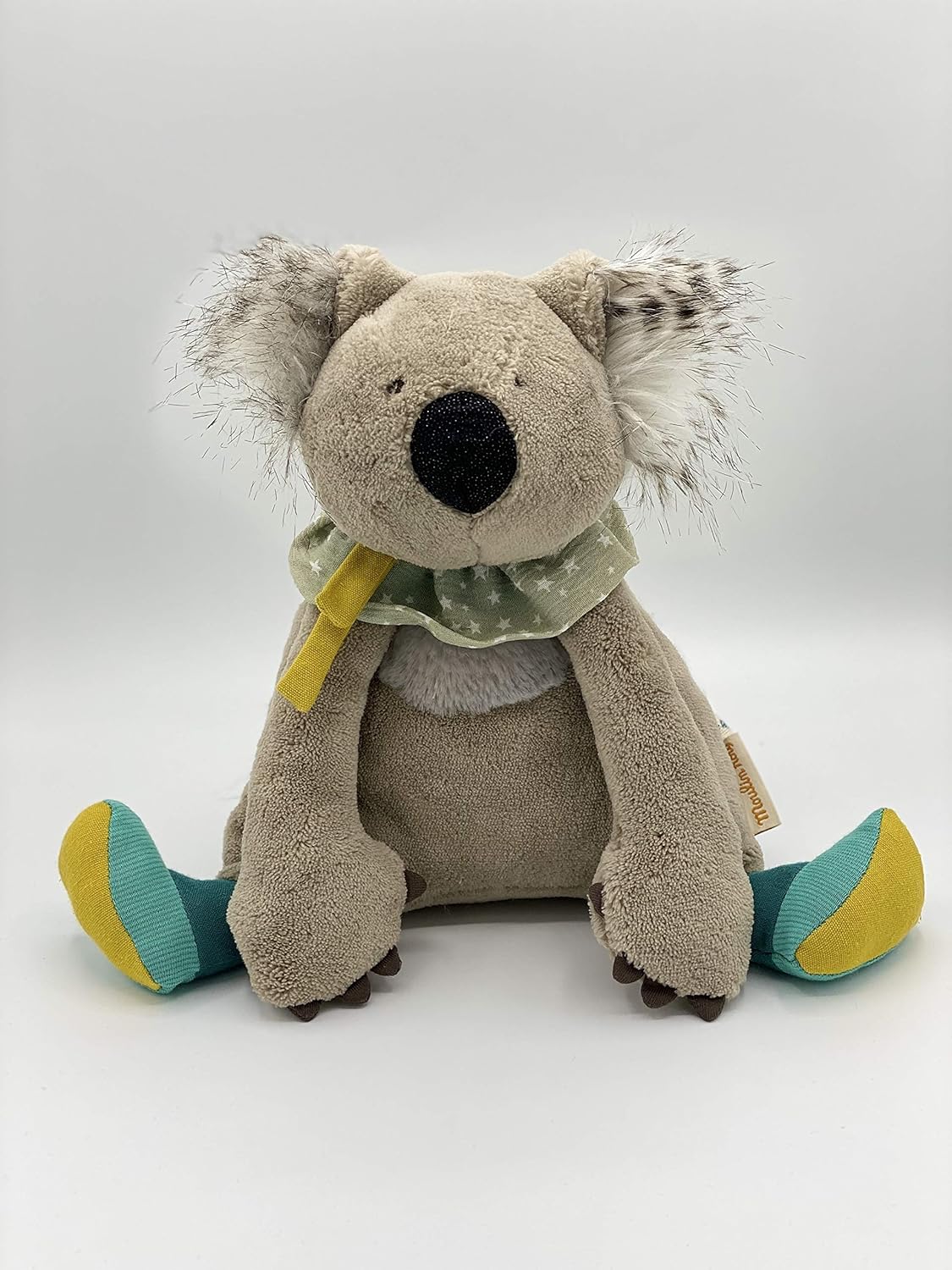 Gabin the koala soft toy, adorably round with large ears and his front in faux fur, an elegant star-spangled collar and agile legs for climbing high in the trees. But best of all he loves just lazing about, the ideal companion for soft gentle cuddles.
